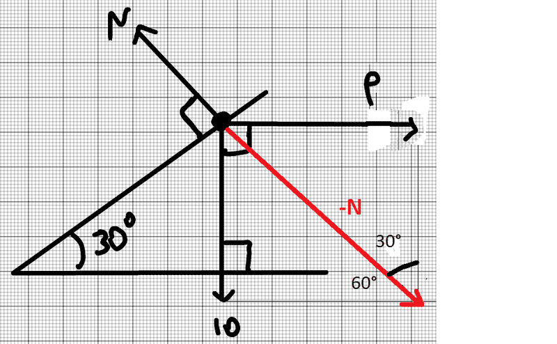 I have used in the Parallel P=10tan60=17.32N. However the answer is given by 10tan30=5.77N. Is the answer wrong? Or have I made inaccurate assumptions?