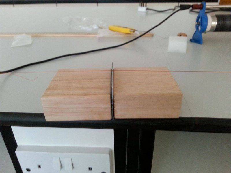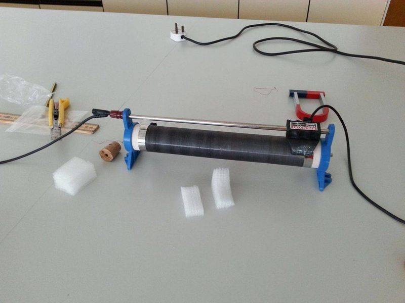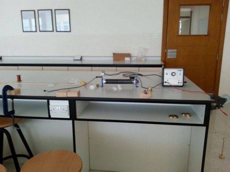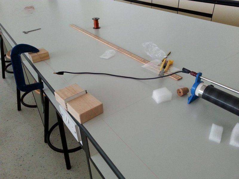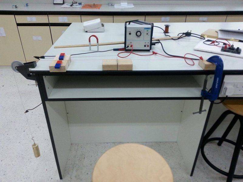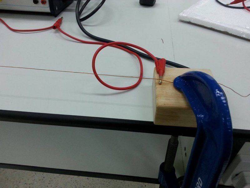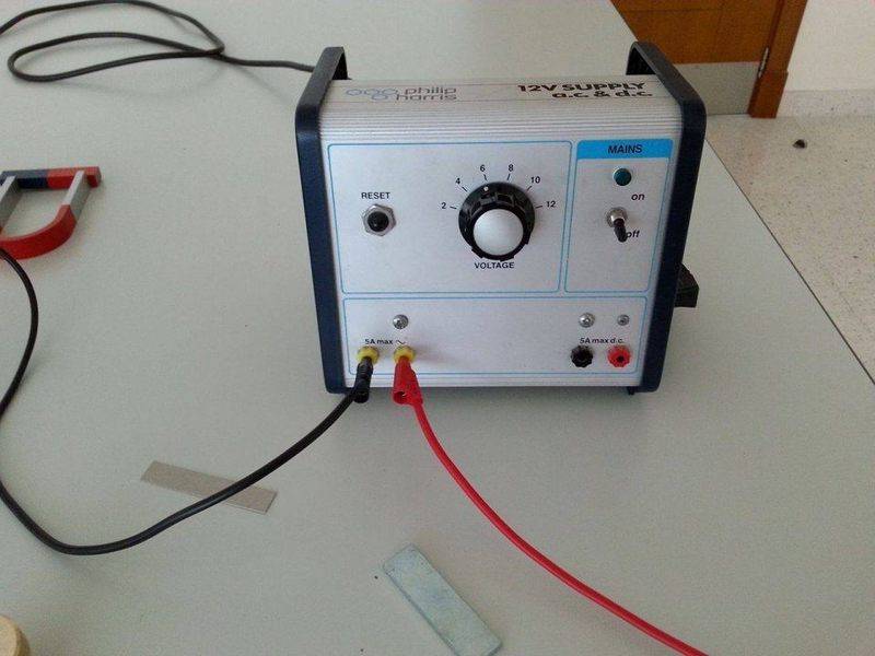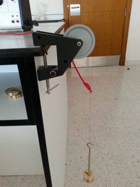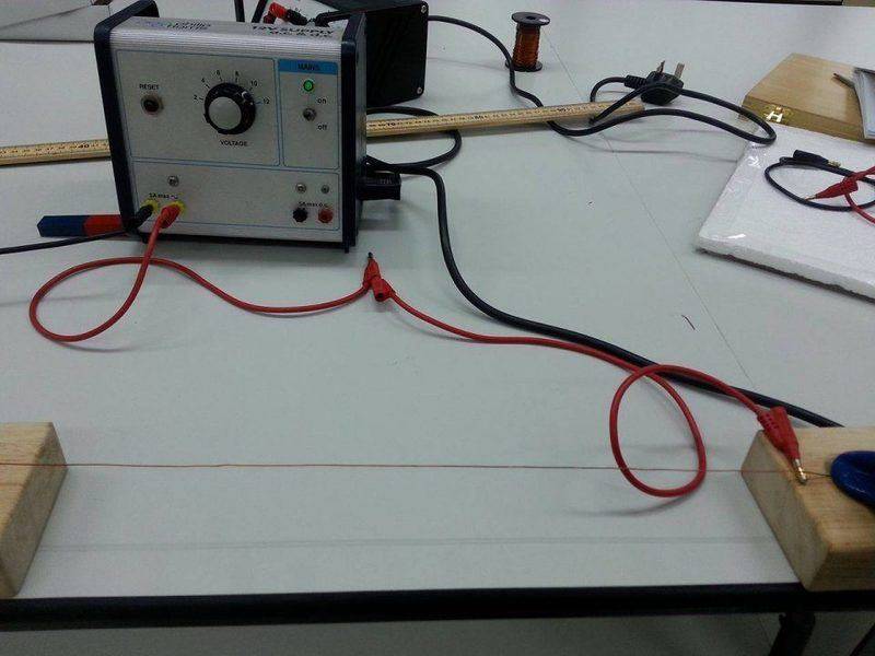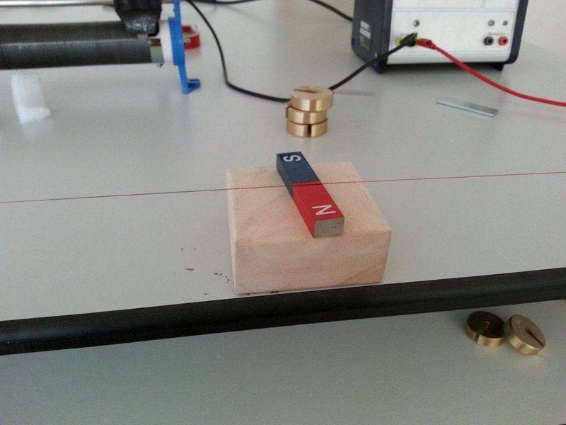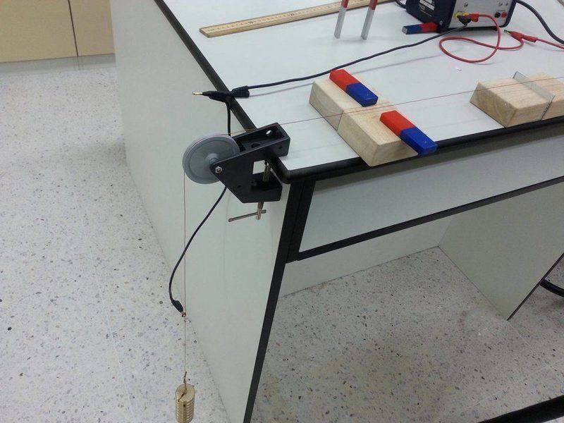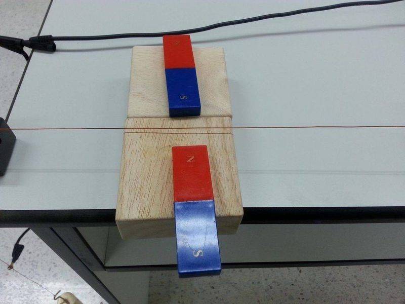 This is actually a lab experiment which includes a stretched string which is clamped to one end with a G-clamp and the other end with a pulley and some masses hung from it. There's a bar magnet placed underneath the string near the pulley and a movable bridge to alter the length of the string. It's connected to an AC supply and a rheostat.