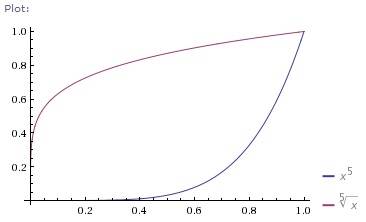 Use the Shell Method to compute the volume of the solid obtained by rotating the region in the first quadrant enclosed by the graphs of the functions y=x^{5} and y=sqrt[5]{x} about the y-axis.