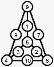 The center is part of the sum for all triangles, we can fill it last with whatever number is remaining and ignore it from now on. For every pair of triangles there are two numbers that are shared between these triangles, and one number that is exclusive to the other triangle. We can find a solution if we can find three mutually exclusive triples that satisfy a+b=c where a+b are put in the shared numbers and c is put on the opposite side. That way the sum in every triangle will be the sum of all numbers apart from the three outer numbers.fresh_42 said:74. Enter the numbers ##1,2,\ldots,10## into the circles, such that the sums of all numbers along the three inner triangles are equal.