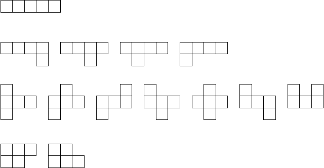 These can only be morphed into one another if you allow a third dimension... a restriction I stuck to and I should have mentioned (i.e. I consider a lefthand glove different from a righthand glove)fresh_42 said:I think we should skip the symmetries of our polyominoes, e.g. 2-5, 3-4. I should have said it, sorry.