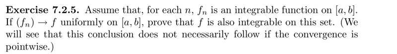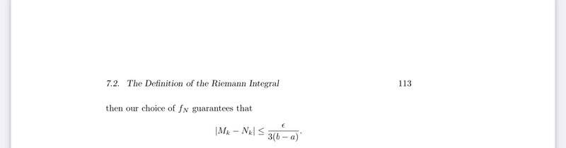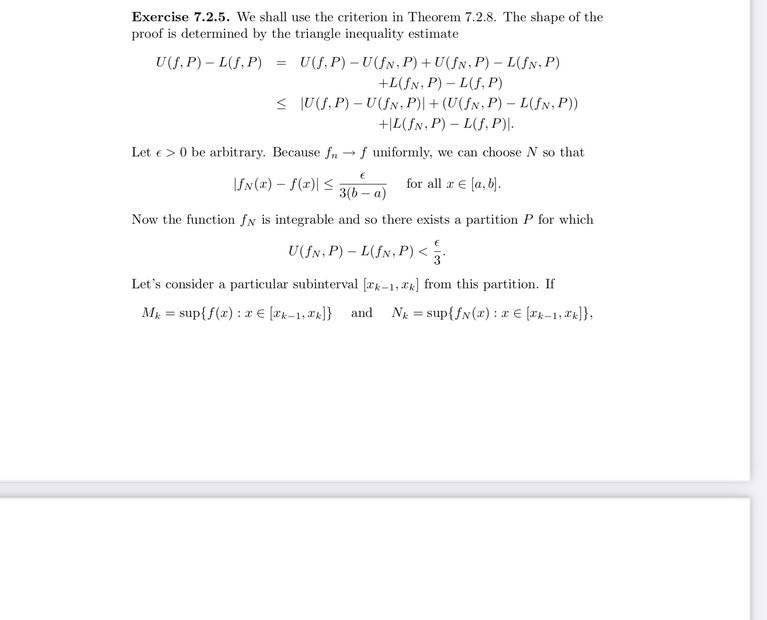 Was reading the Reimann integrals chapter of Understanding Analysis by Stephen Abbott and got stuck on exercise 7.2.5. In the solutions they went from having |f-f_n|<epsilon/3(a-b) to having |M_k-N_k|<epsilon/3(a-b), but I’m confused how did they do this. We know that fn uniformly converges to f, that means for any epsilon greater than 0 I can find natural number M st when n is greater than M then the distance from fn to f is less than epsilon for all x in the interval [a,b], but the supremums of fn and f in a sub interval [x_k-1,x_k] might occur at different values and I’m not sure how they’re meant to be at most epsilon apart.