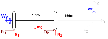 M_x+N_1(150m+0.75m)+N_2(150m-0.75m)-mg150m=I_{xx}\dot\omega-I_{yz}w_z^2