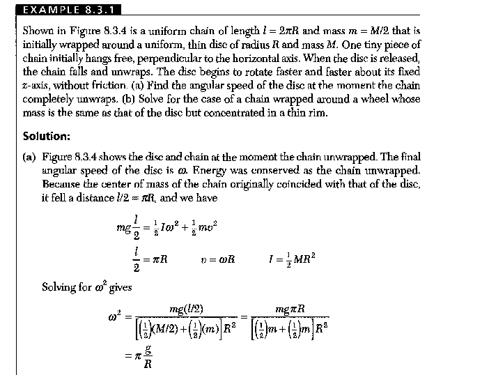 The gravitational potential energy of the chain's center of mass is equal to the total kinetic energy of the disc once fully wrapped, as established in the discussion. The equation governing this relationship is mg(l/2) = (1/2)Iω² + (1/2)mv², where I represents the moment of inertia and ω the angular velocity of the disc. This example is derived from "Analytical Mechanics" by Fowles, illustrating the conversion of potential energy into both rotational and translational kinetic energy. The distinction between the mass variables (m and M) is crucial for accurate calculations.