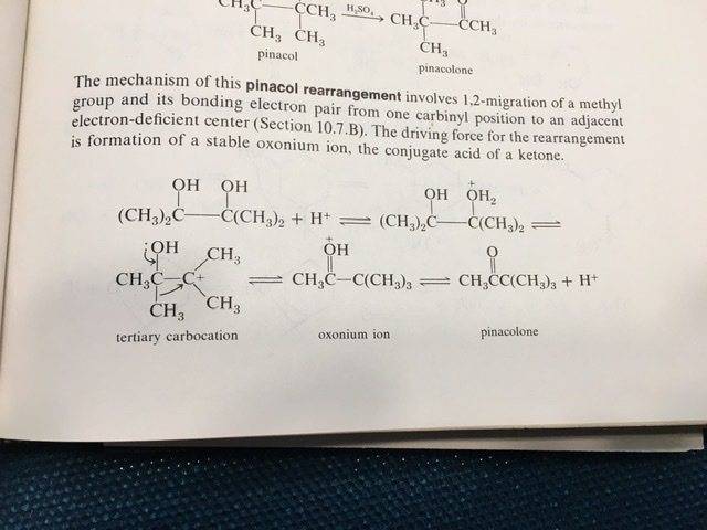 - Participants discuss the pinacol rearrangement, noting that it typically starts with a 1,2-diol and involves protonation of an alcohol to form a carbocation adjacent to another alcohol.