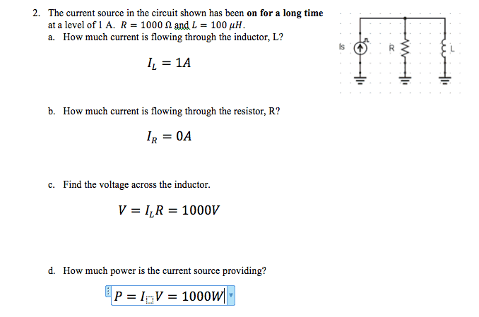 Participants are actively questioning assumptions about voltage drops and power in the circuit. Some guidance has been offered regarding the behavior of inductors and the conditions under which they can be treated as having zero resistance, but no consensus has been reached on the implications for power supplied by the current source.