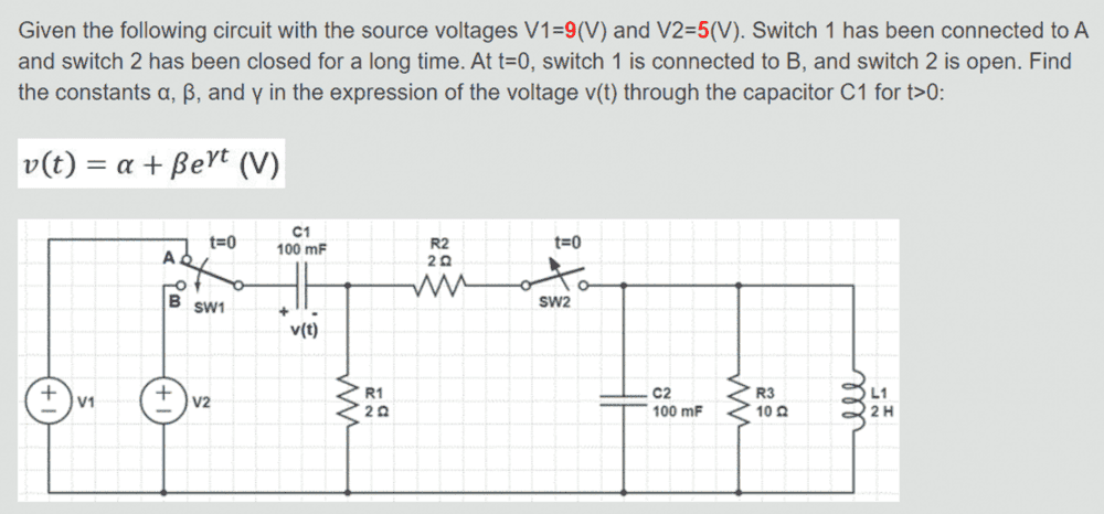 - Given the following circuit with the source voltages V1=9(V) and V2=5(V). Switch 1 has been connected to A and switch 2 has been closed for a long time. At t=0, switch 1 is connected to B, and switch 2 is open. Find the constants α, β, and γ in the expression of the voltage v(t) through the capacitor