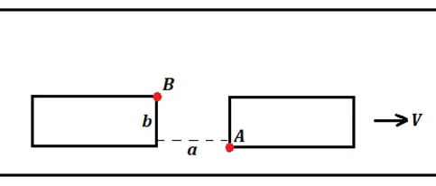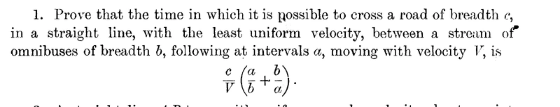 Prove that the time in which it is possible to cross a road of breadth ##c## in a straight line, with the least uniform velocity, between streams of busses of breadth ##b##, following at intervals , moving with velocity ##V##, is ##\frac{V}{c}(\frac{a}{b} + \frac{b}{a})##