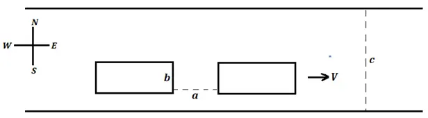 Each bus is length ##b## , and if we start from the edge of the road aligned with the front of the bus, we need to traverse a diagonal distance ##\sqrt{(a+b)^2 +(c/2)^2}## in time ## (a+b)/V##