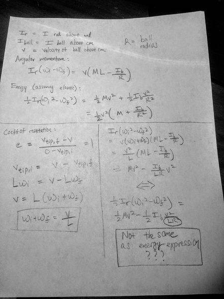 The angular momentum expression is: $$I_{rod}\omega_i = I_{rod}\omega_f + MLv_{ball,cm} + I_{ball,cm}\omega_{ball}$$ This second and third terms on the right come from the first equation I listed in "Relevant equations." I am defining counter-clockwise to be positive, so the translational contribution to the angular momentum of the ball (the second term on the right) should also be positive. However, the third term should be negative overall since the ball will be rotating clockwise. Since the ball isn't slipping, I can replace ##\omega_{ball} = -v_{ball,cm}/R##. So then: $$I_{rod}\omega_i = I_{rod}\omega_f + MLv_{ball,cm} - I_{ball,cm}v_{ball,cm}/R$$ I still need another equation to relate ##\omega_f## and ##v_{cm}##. I believe I can use linear momentum conservation for this: $$m_{rod}v_{rod,cm} = m_{rod}v'_{rod,cm} + Mv_{ball,cm}$$ The velocity of the rod's center-of-mass, I believe, should be such that ##v_{rod,cm} = \omega r##, where r is the distance from the axis to the center-of-mass of the rod (i.e. ##L/2##). So then this becomes $$m_{rod}\omega_i L/2 = m_{rod}\omega_f L/2 + Mv_{ball,cm}$$ Plugging in the values here, I get that relation that $$\omega_f = \omega_i - v_{ball,cm}$$ Now, if I substitute this into the angular momentum expression and solve, I get that ##v_{ball,cm}## is essentially 0, which intuitively cannot be correct. What is wrong with my approach?