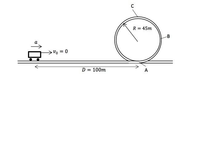 A roller coaster is designed in an area of the park that is gravity-less. The roller coaster will accelerate a cart with a total mass of 10kg, from the initial position as shown in the figure to point A. After passing through point A, the cart will no longer speed up and have constant speed as it goes around the loop with radius R.