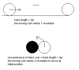 Now imagine rolling a coin on another stationary coin with the same radius (circumference = 2[pi] = length of the first track). How can it be that it requires 2 revolutions? Is it because the real track isn't the black coin but the trace of the circle's center when moving (which equals 4[pi])?