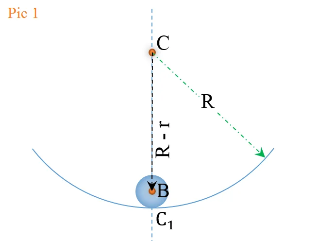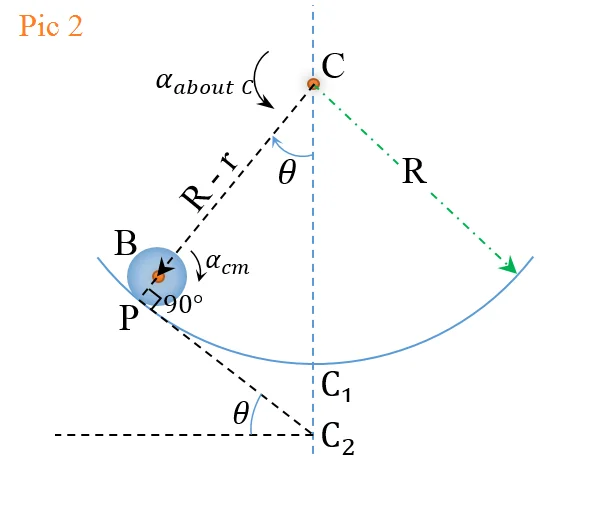 However, now take a look at this pic(Pic 2 below), when the ball is rotating about an axis passing through it's own centre of mass, i.e. point B and perpendicular to the page, and also simultaneosuly rotating about an axis passing through the point C(centre of curvature of concave surface) and is perpendicular to the page.
