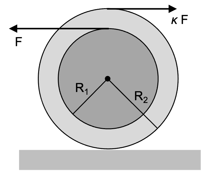 A yo-yo of radii ##R_1=R## and ##R_2=\frac{7}{5}R## is acted upon by forces ##F## and ##\kappa F~~~(0<\kappa<\infty)## as shown in the figure on the right. The yo-yo rolls without slipping on the horizontal surface. The mass of the yo-yo is ##M## and its moment of inertia about its center of mass is ##I=qMR_2^2##.