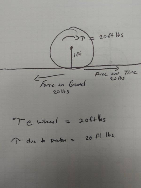 The problems I am having is when I consider what the magnitude of the force exerted on the road from the wheel would be, or specifically the equal and opposite force exerted back onto the wheel from the road via static friction. The reason for this is because I want to say that it is just the torque exerted on the wheel by the engine divided by the radius of the wheel but that seems to lead to a ridiculous conclusion. If I follow that logic, then the equal and opposite force exerted on the wheel by the road, multiplied by the radius of the wheel to get the counter-torque, is equal to the torque exerted on the wheel by the engine but in the opposite direction. That of course would mean that there is no net torque and the wheels would never move (unless the force were greater than that available from static friction but then it would just slip) which means that the car would never be able to move!