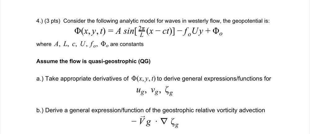 The discussion revolves around deriving general expressions from an equation of geopotential of waves in a westerly flow. Participants are exploring the mathematical aspects of this problem within the context of fluid dynamics and wave theory.