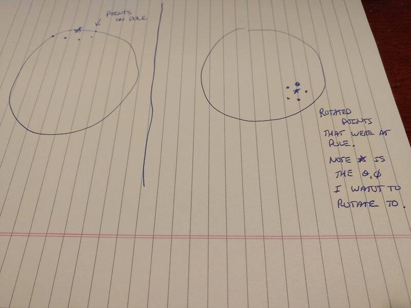 My goal is to rotate several points on a sphere by a theta and phi. For example, I have a sphere where the elevation is theta (90 to -90) and the azimuthal is phi (-180 to 180). I have the following points on the sphere: