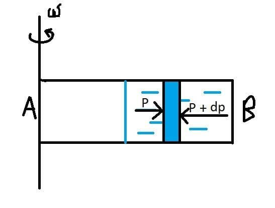 A horizontally oriented tube is rotating with angular velocity ω about one end of the tube which is open. The tube has ideal liquid filled inside it as shown in the attachment. Why does there have to be a pressure difference between two points in the ideal liquid at the same horizontal level?