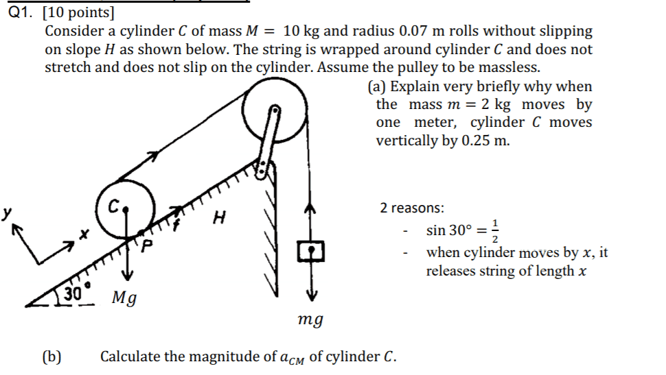 - Consider a cylinder c of mass m = 10 kg and radius r 0.07 m rolls without slipping on slope H as shown below. The string is wrapped around cylinder c and does not stretch and does not slip on the cylinder. Assume the pulley to be massless.