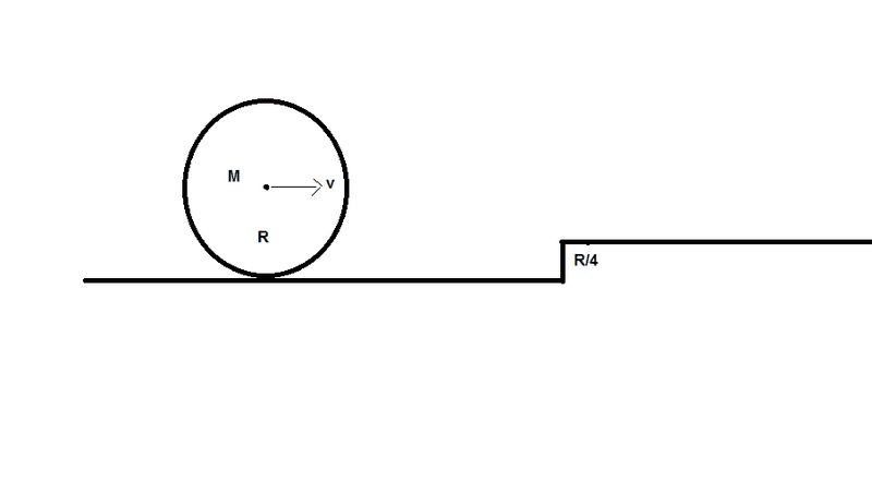 A solid sphere of Mass M and Radius R rolling (pure) encounters a protrusion on the surface of height R/4. Its in the form of a step. What can be the maximum velocity V of sphere so that it doesn't leave contact from surface and final velocity?