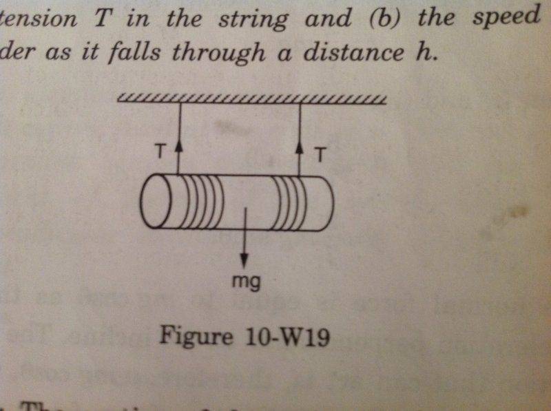 Find the tension T in the string and the speed of the cylinder as it falls through a distance h.