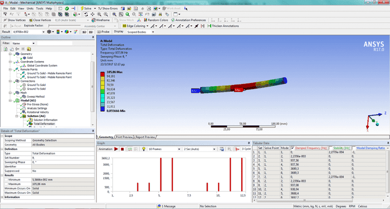 i am currently doing a rotor analysis with "modal analysis" on Ansys and even though my rotor's specs are L=145mm D=10mm and the rotating velocity is 10000rpm i get a deformation of 100mm at most of the modes. I have read that this might be cause of a mass-normalized value but i am not sure if that's the case. Does anyone know why is this happening and if so, can i change it so i can see the real value?