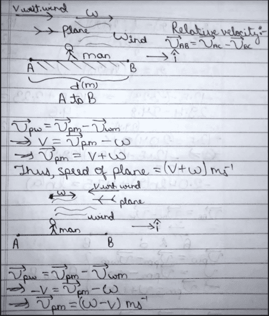 You proceed to re-use the same variable names for the upwind leg. Again, you are careful with the sign conventions. This time the plane's velocity relative to the ground is the negation of its ground speed.