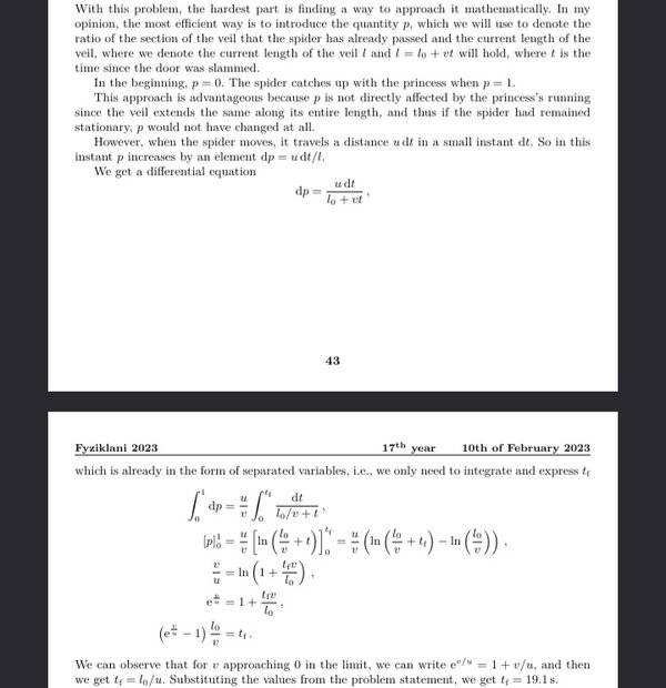 If the veil stretches prefectly, then when the princess moves by ##\Delta x##, then if the spider was not moving, he would also move by ##\Delta x## from the door, so he would be in the same distance from the princess. So assuming it, the time would be ##t_f=\frac {l_0}{u}## but that is no obviously correct.