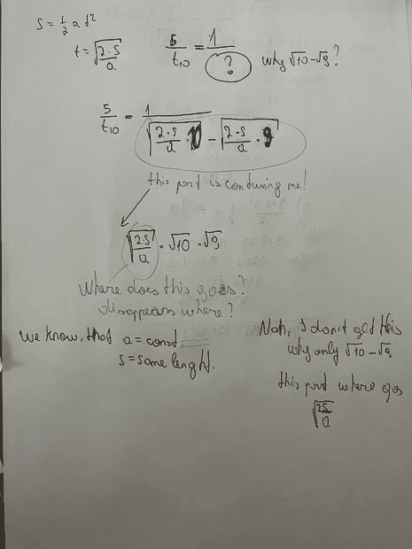 Now please, if you look at picture, you see its t1/t10=1/(sqrt(10)-sqrt(9))My question is, why its in squeroot? Where do we get x^2? so to get squeroot we need x^2! but from what? Why the lenght, it its meter it should be as meter, so where we get m^2? What am i doing wrong. Thanks for any explenation!