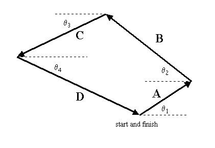 The magnitudes of the first three vectors are A = 3.0 km, B = 5.0 km and C = 4.5 km. The finish line of the course coincides with the starting line.