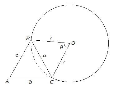 So we have a triangle ABC with given sides. On the BC side, there's a part of a circle (we do not know how much of a circle). We are asked to find the angle A to ensure that the part of a circle has the same area as the triangle. The problem boils down to finding how to calculate the area of the part of circle. So how would you go about doing it?