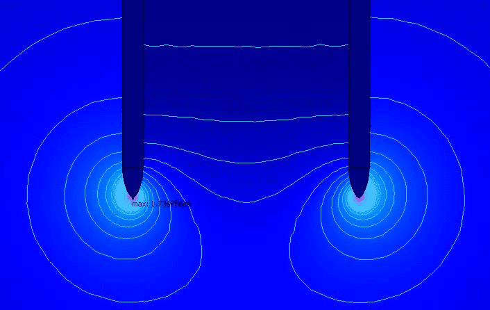 In the first case potential somewhere between the electrodes is between the potentials of the electrodes.