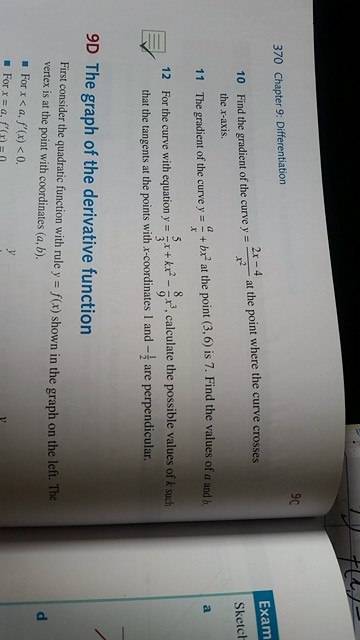 $\displaystyle \begin{align*} \frac{\mathrm{d}y}{\mathrm{d}x} &= \frac{5}{3} + 2\,k \,x - \frac{8}{3}\,x^2 \\ \\ \frac{\mathrm{d}y}{\mathrm{d}x} | _{x = 1} &= \frac{5}{3} + 2\,k \cdot 1 - \frac{8}{3} \cdot 1^2 \\ &= 2\,k - 1 \\ \\ \frac{\mathrm{d}y}{\mathrm{d}x} |_{x = -\frac{1}{2}} &= \frac{5}{3} + 2\,k \cdot \left( -\frac{1}{2} \right) - \frac{8}{3} \cdot \left( -\frac{1}{2} \right) ^2 \\ &= 1 - k \end{align*}$