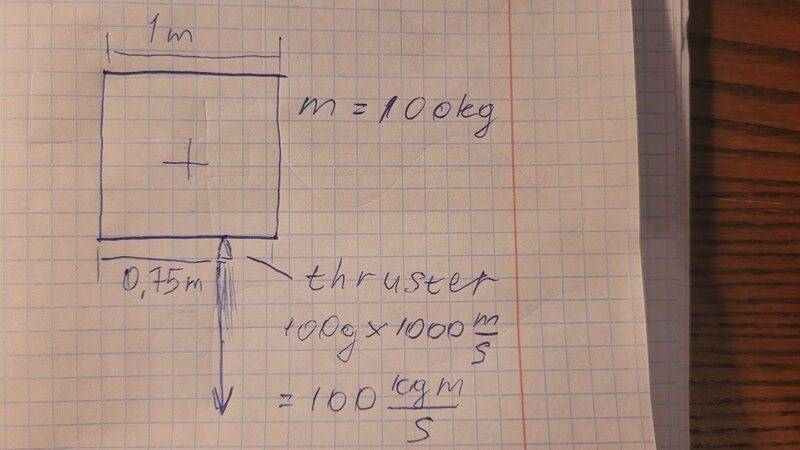 Say we have a squared satellite weighting 100kg, 1 meter on each side. it has a thruster on it's side, shown in picture
