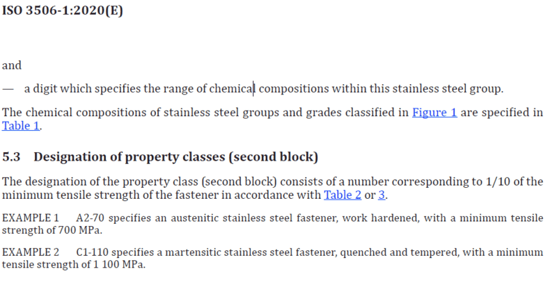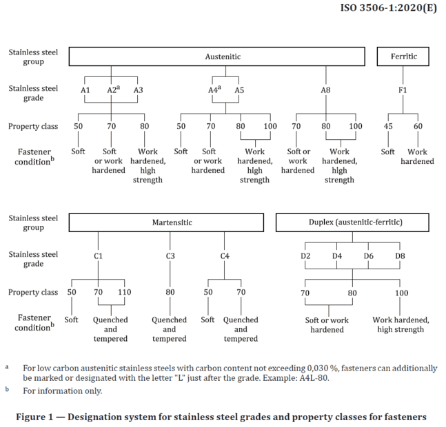 Stainless steel screws are denoted by their grade and property class (mechanical strength) in ISO 3506-1.