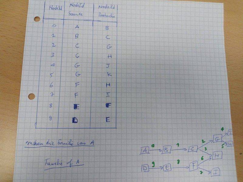 i have started to write an "algorithm" that finds the Family of a given element in a table of 3 columns: Id, Source and Destination. When i say Family i mean each element (i.e. A) from Source that has a relation with another one in Destination and i have to find a family for that new (element) one (coming from A) and so on till there is no sucessor more. May be it would be clear with what i have done so far? please don't be rude :) Thanks (Approach below)