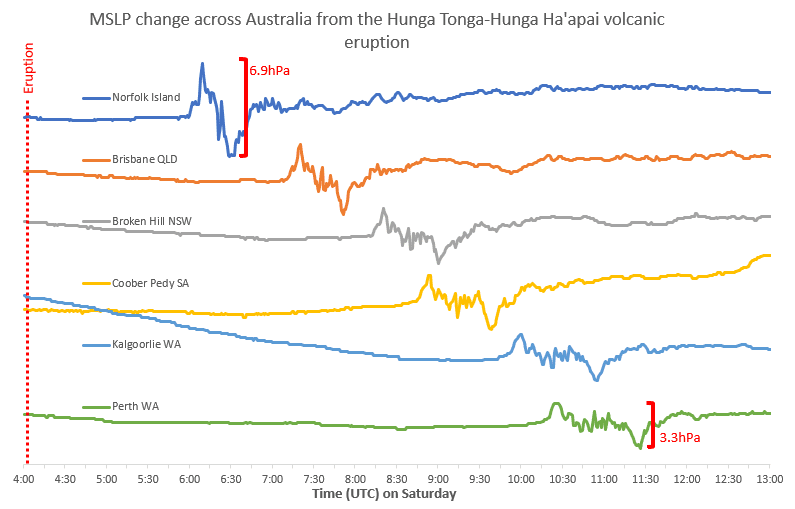 - Weather station recording pressure at my home registered the shockwave from Tonga eruption twice, as it was traveling around the globe. That's expected, but what is the physics behind the fact second shockwave registered as a drop in the pressure, not as a spike?