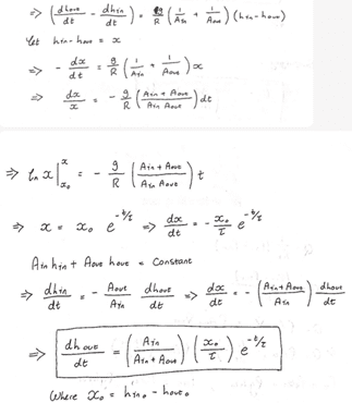 2. Substitute that ##\ Q(h_1-h_2)\ ## in ##(3)##. We now have one first order differential equation (DE) in terms of one time-dependent variable ##h_1-h_2## and the form is like ##\ y'= -ky\ ## with ##k>0##