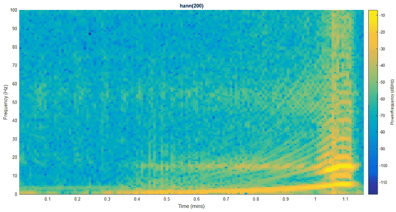 the image shows what accelerometers captured, before seg70 the system doesn't shake almost a thing. but, it starts shaking in (relatively) high frequencies with ~4.5hz. confused, i send that response to frequency domain and found: