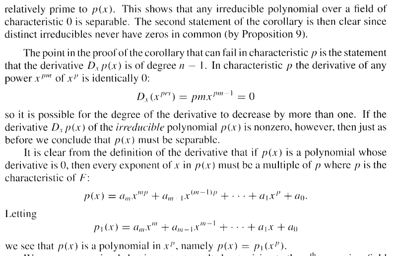 I am assuming that when the degree of the derivative decreases by more than ##1, p(x)## is still relatively prime to ##D_x p(x)## and so ##p(x)## is separable ... is that the correct reasoning here ...Question 2