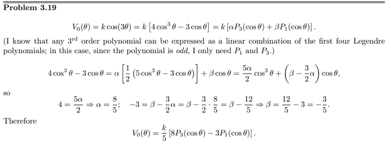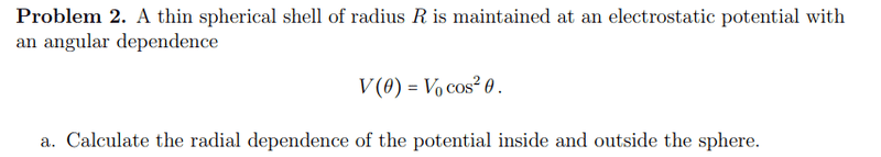$$V_0 \alpha P_2 (\cos(\theta)) \Rightarrow \frac{\alpha 3 \cos ^2 (\theta)}{2} - \frac{\alpha}{2} \Rightarrow \frac{\alpha 3}{2} - \frac{\alpha}{2}= 1 \Rightarrow \alpha = 1$$