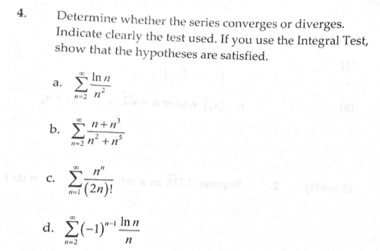 As for the b, c, and d, I got convergent by limit comparison, convergent by the ratio test (since r is 0, I'm doubting my answer to this one too.), and convergent by the ratio test.