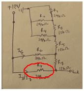 The discussion revolves around an R/2R ladder network circuit, specifically focusing on the determination of the output voltage (Vout) after a certain resistor (R8). Participants are examining the accuracy of a circuit redraw and clarifying the concept of voltage measurement in relation to circuit components.