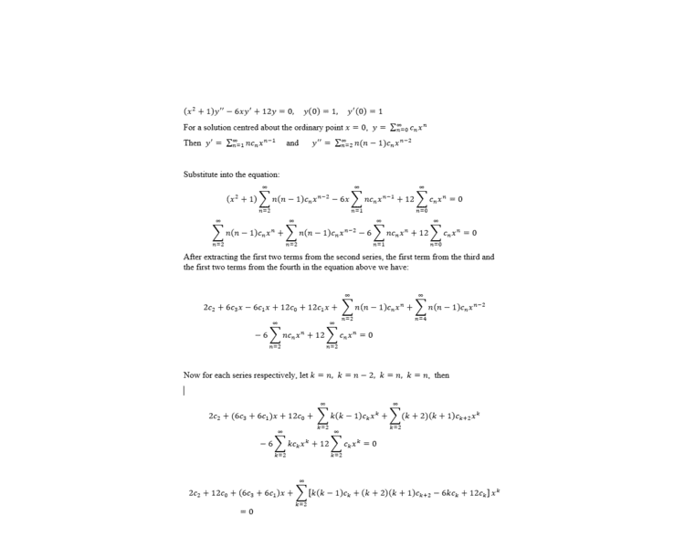 The discussion revolves around solving a second order ordinary differential equation using the power series method. The specific equation is given as (x^2 + 1)y'' - 6xy' + 12y = 0, with initial conditions y(0) = 1 and y'(0) = 1.
