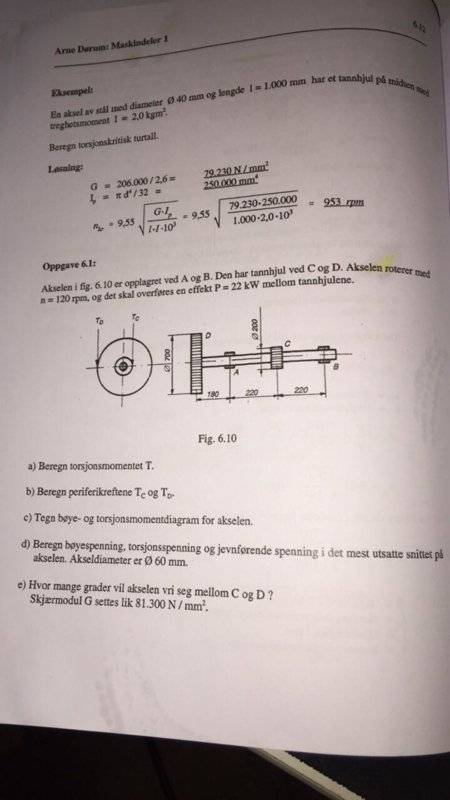 I need help with a task. I have done previous calculations on the shaft, but I'm stuck now, as I'm going to find out how many degrees the shaft is twisting from point C to D. I have calculated bending/shear stress, torsion stress and the last stress that i don't know in english, but the formula is like this: