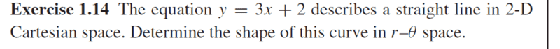 The discussion revolves around the shape of the equation y = 3x + 2 when expressed in polar coordinates, specifically in r-θ space. Participants explore the implications of converting Cartesian coordinates to polar form and the resulting graphical representation.