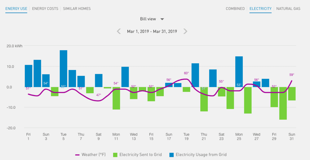 The third picture shows one year of history. Same colors. In winter, this home's energy consumption increases, while lack of sunlight cuts solar production. The home has a heat pump. AC in the summer is almost never used. That pattern is reflective of the local climate. I like it that the peaks and valleys in the data clearly show the weather pattern of cold fronts passing across the continent about 5 days apart.