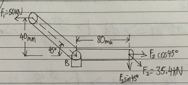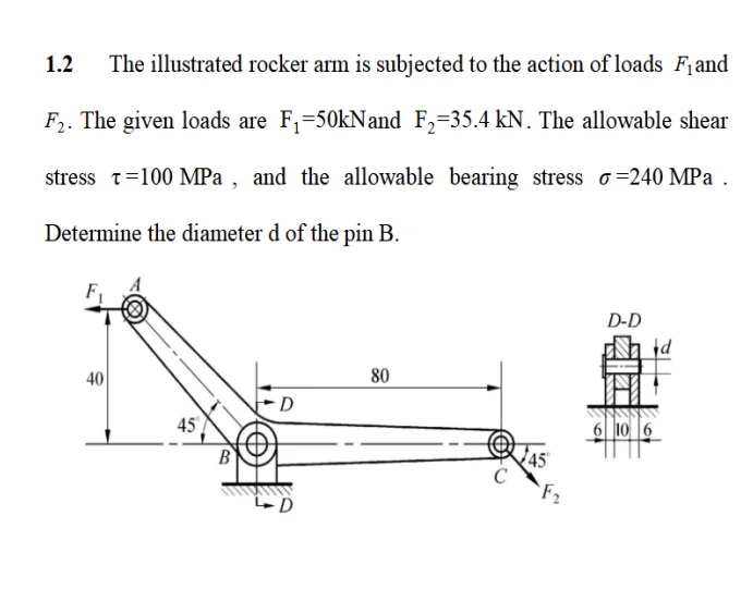 - The illustrated rocker arm is subjected to the action of loads F1 and F2. The given loads are F1=50kN and F2,=35.4kN. The allowable shear stress τ=100 MPa ,and the allowable bearing stress σ=240 MPa. Determine the diameter d of the pin B.