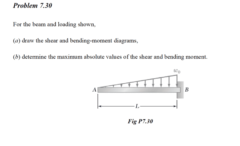 ok so for concentrated loads the sheer diagram is constant meaning are straight horizontal lines and the bending moment diagram is linear. when there are evenly distributed loads sheer diagram is linear and bending moment diagram is quadratic. I am thinking that when there is a load distributed linearly like in the picture below the sheer diagram would be quadratic and the bending moment diagram cubic. I am kind of stuck on this problem all the variables make it harder to visualize what is happening I have done this so far but i got stuck when trying to find the bending moment.