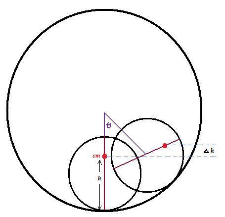 ##\Delta h = (R-r)(1-cos\theta) - (h-r)[1-cos(\frac{R-r}{r}\theta)]##